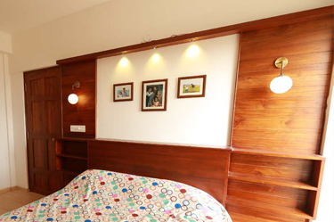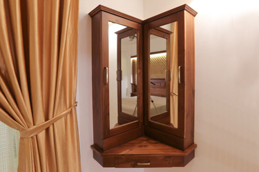All the three bedrooms are fitted with wall high cupboards in teakwood. In the master bedroom, the wardrobe comes with a half-length mirror and space for dressing table. There is also a custom designed wall mounted corner dressing table with doors opening from both sides. The washroom counter has covered storage along with racks on the sides for further options.