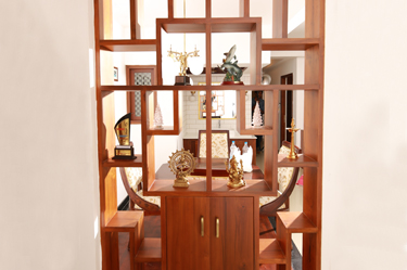 The teak wall divider has been innovatively designed into an open shelf for art and décor items. It gives the foyer a spacious and artistic effect while also maintaining adequate privacy and partitions. This designer wooden wall partition is a tasteful addition to the living room decor, perfectly balancing the timelessness of the wood and trendy designs.